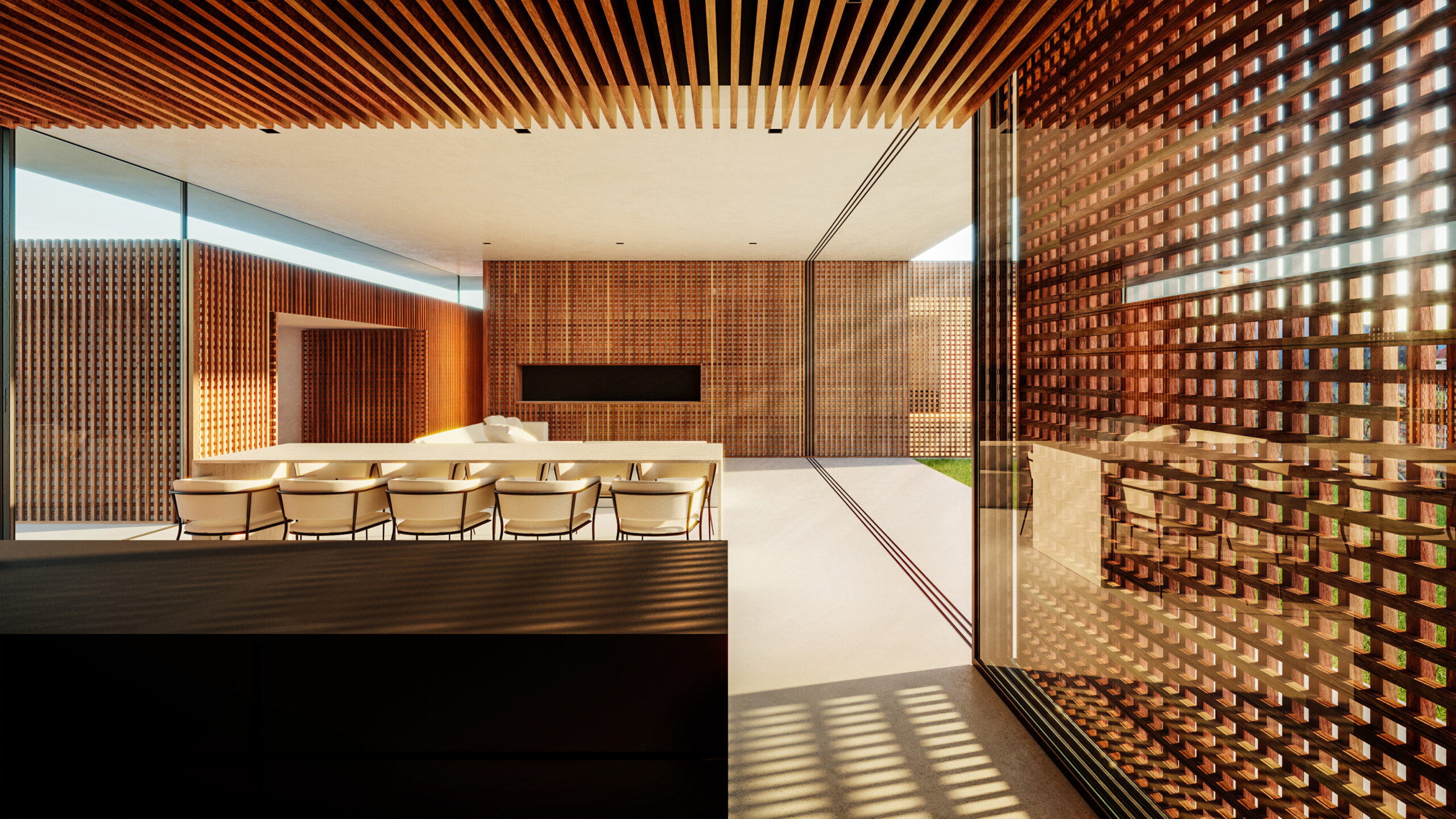 A sala hóspeda o mais nobre dos programas requeridos, é a praça, é o vazio, o espaço que se mistura com o exterior graças à transparência dos teus envidraçados e onde convergem todas as atividades.