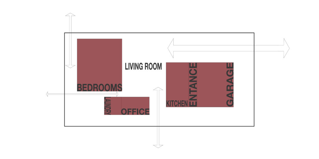 Rompemos, então, aquele grande volume que continha todo o programa requerido para sucessivamente dividi-lo em elementos mais pequenos que hospedassem os serviços como os quartos, cozinha, o escritório e as instalações sanitárias (como as casas de uma cidade);