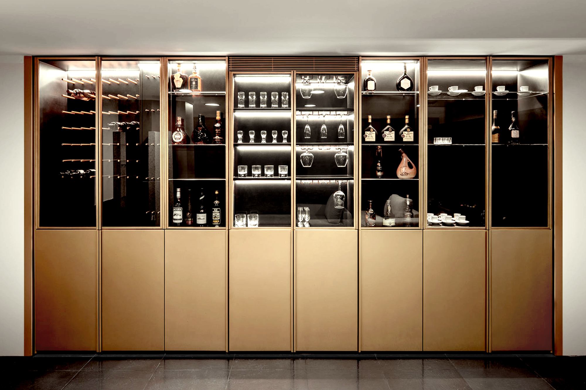 Dipinto dei colori del vino, nelle sue tonalità di nero e oro è una fonte di luce, diventando così l’epicentro dello spazio che lo accoglie.